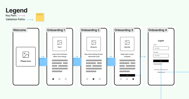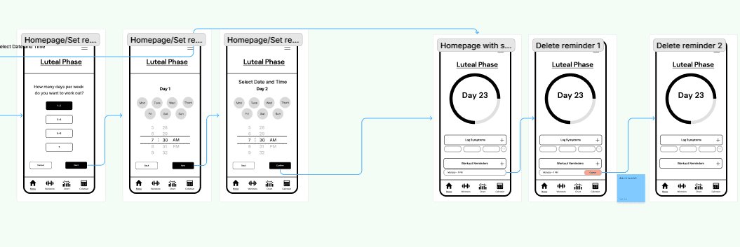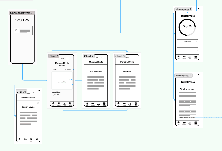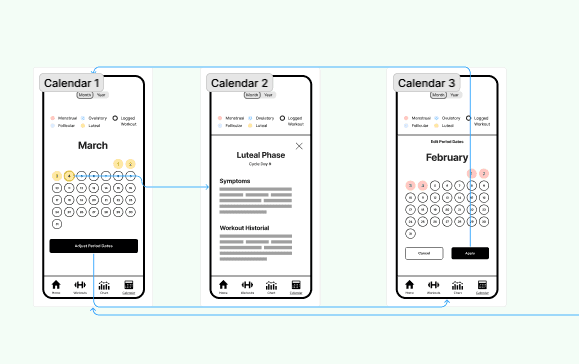 Wireframes were created to establish a clear, organized structure across core screens, including onboarding, the home experience, cycle charts, workouts, and the calendar. This phase focused on hierarchy and flow to ensure information felt approachable and easy to navigate.