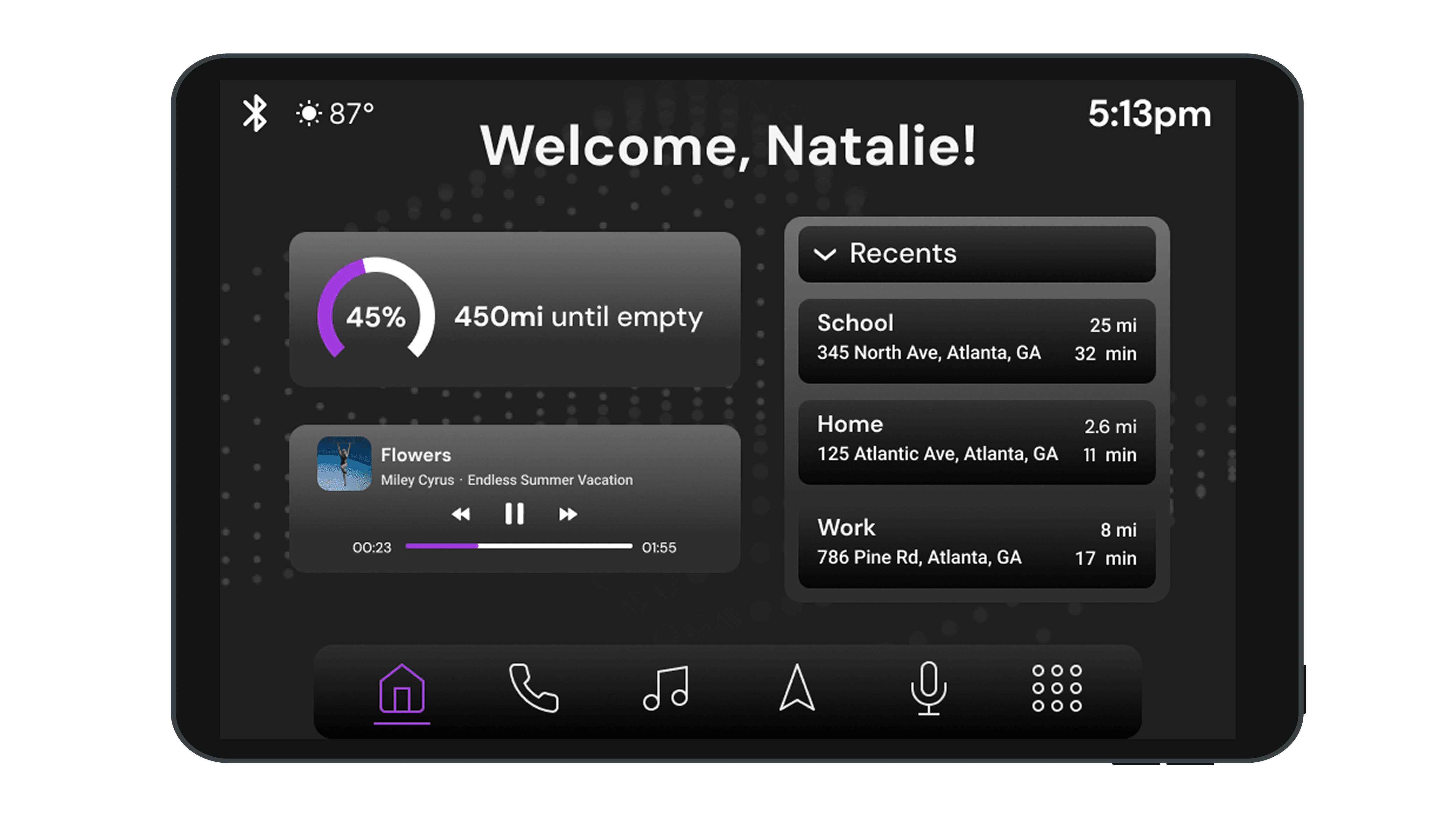 Praxis prioritizes clarity, comfort, and trust through clean layouts and minimal visual noise. Features like voice assistance, subtle motion, and personalized greetings reduce distraction while helping drivers feel confident and connected.